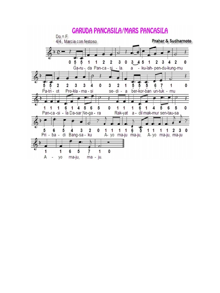 Lagu garuda pancasila diciptakan oleh p. Lagu ini menjadi lagu pemersatu bangsa sebagai pedoman bangsa. Burung garuda digunakan sebagai simbol negara guna menggambarkan bahwa negara indonesia adalah bangsa yang besar dan negara yang kuat. Tentu hampir semua rakyat indonesia pernah mendengarkan lagu wajib ini. Berikut ini adalah not angka lagu yang berjudul garuda pancasila karya sudharnoto yang dapat kamu mainkan not angkanya pada seruling, piano, pianika. Lagu wajib nasional garuda pancasila cipta sudharnoto versi pianikatempo sengaja di perlambat agar mudah di mengerti. Garuda pancasila sebagai lambang negara indonesia juga memiliki lagu yang berjudul garuda pancasila. Garuda pancasila merupakan burung garuda yang dikenal melalui mitologi kuno dalam sejarah bangsa indonesia. Lagu ini merupakan lagu wajib yang sangat terkenal. Nama ini terdiri dari dua kata dari sanskerta: Garuda pancasila akulah pendukungmu patriot proklamasi sedia berkorban untukmu pancasila dasar negara rakyat adil makmur sentosa pribadi bangsaku ayo maju maju ayo maju maju ayo maju maju. Pancasila adalah pilar ideologis negara indonesia. Home » garuda pancasila » lagu nasional » not angka pianika lagu garuda pancasila.
